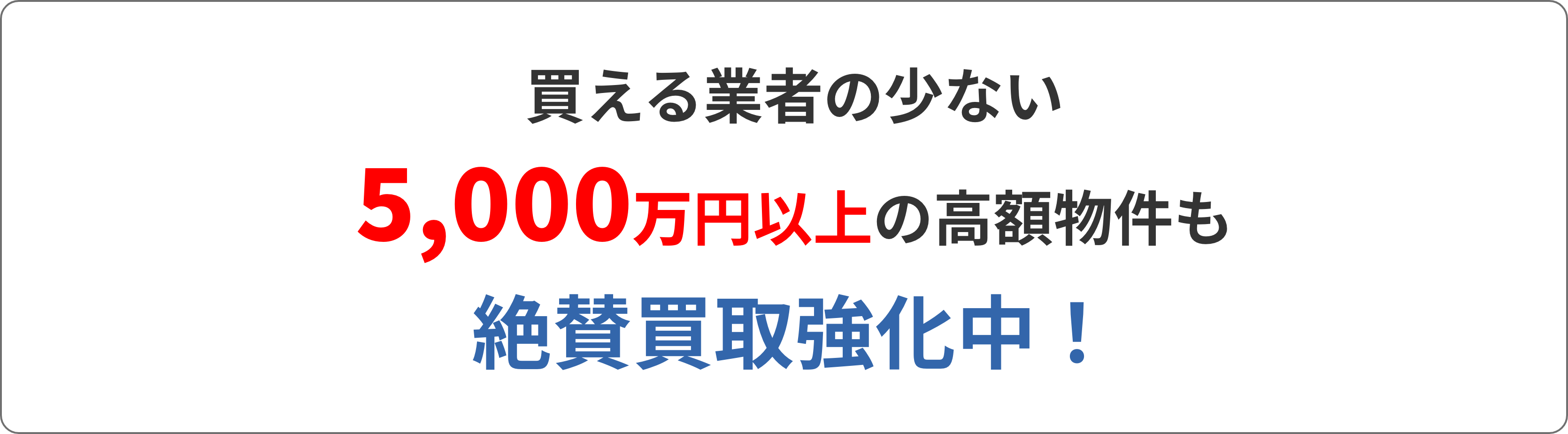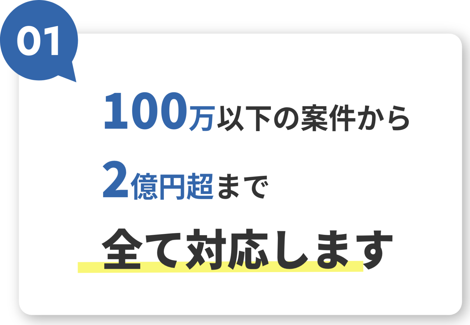 当社は、100万円以下の小型案件はもちろん、数千万~数億円といった大型案件に対しても適正な金額査定を行えます。他社で断られてしまった、査定が低かった、対応に不信感があるという方は、一度当社にもご相談ください!