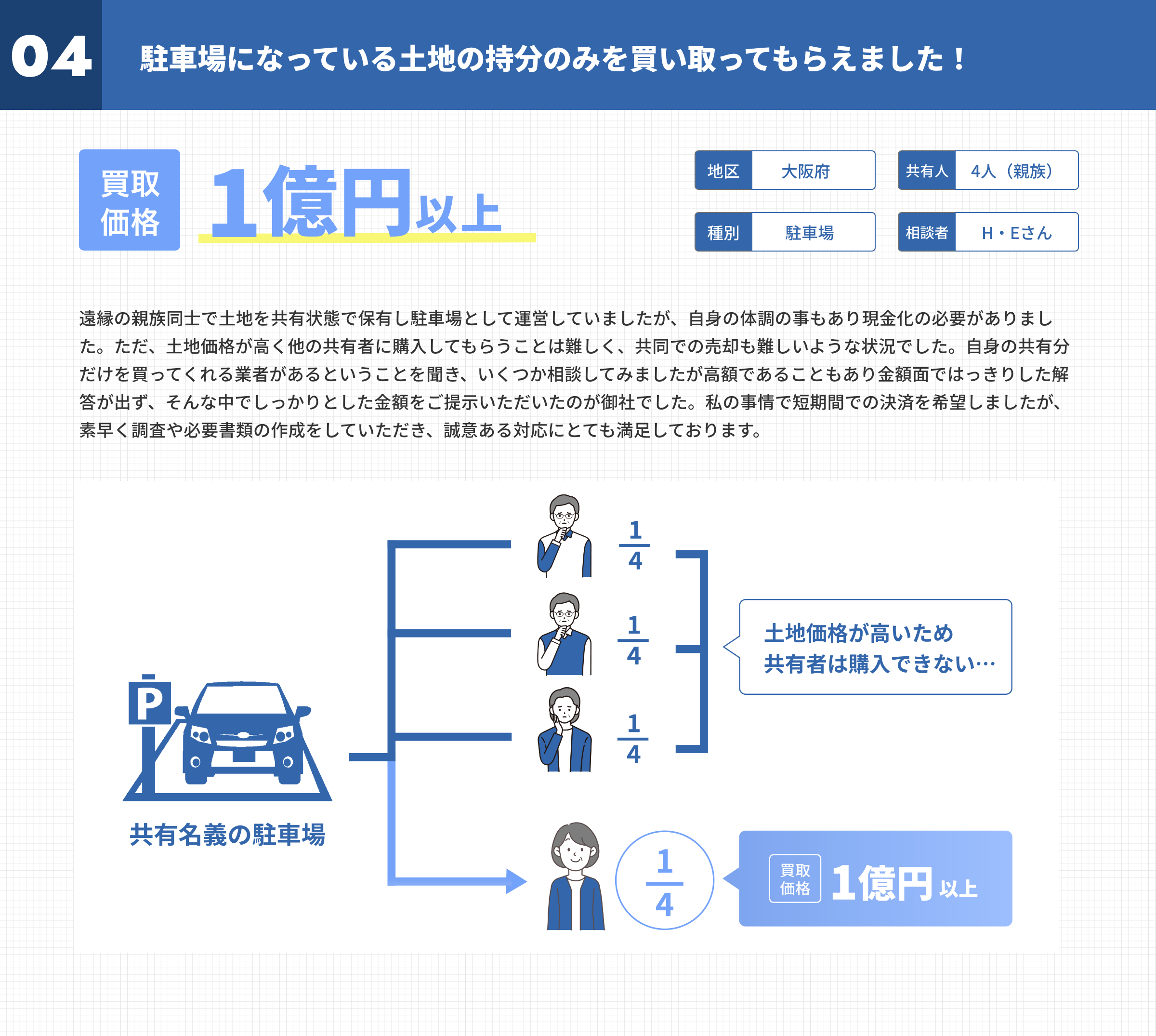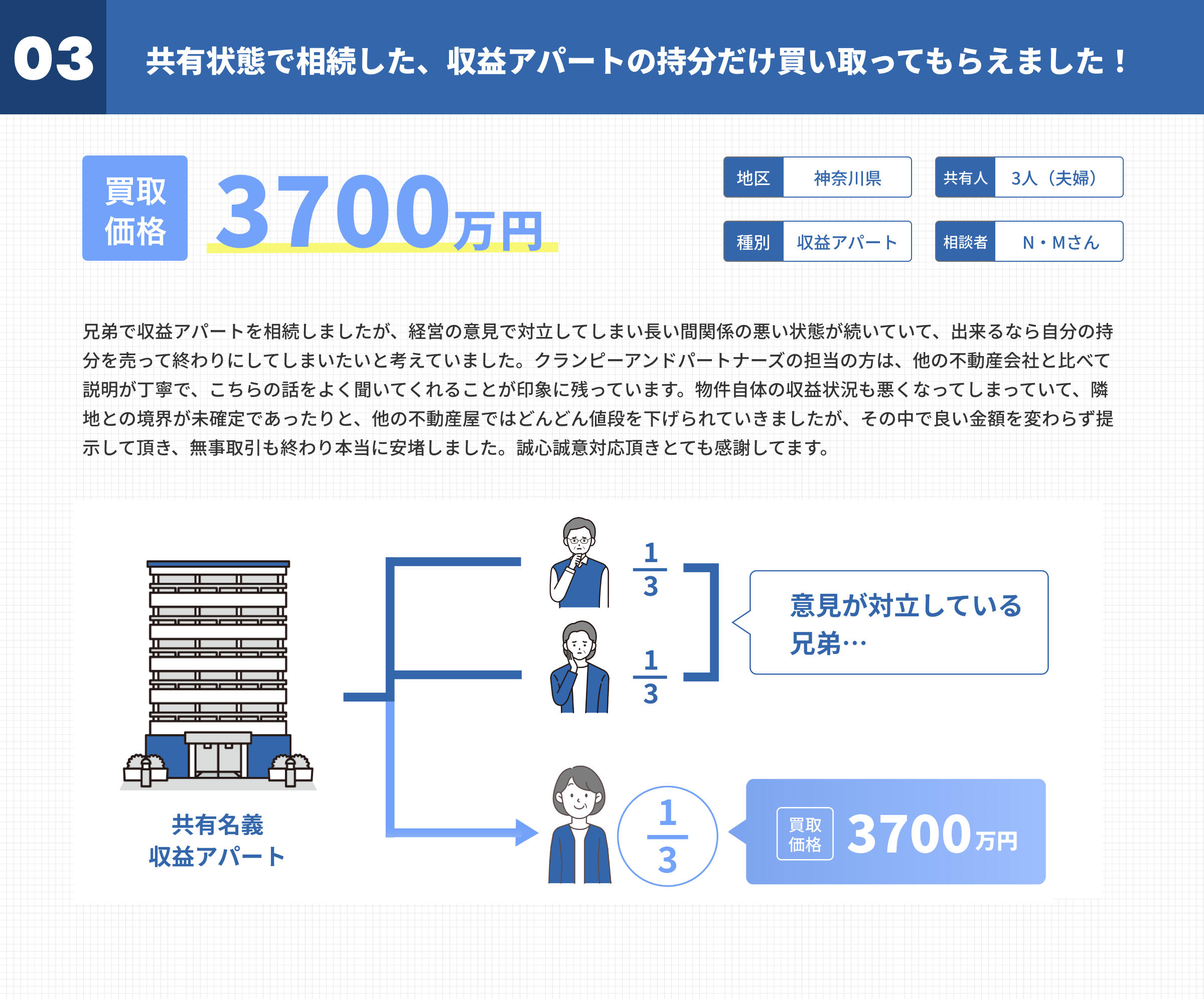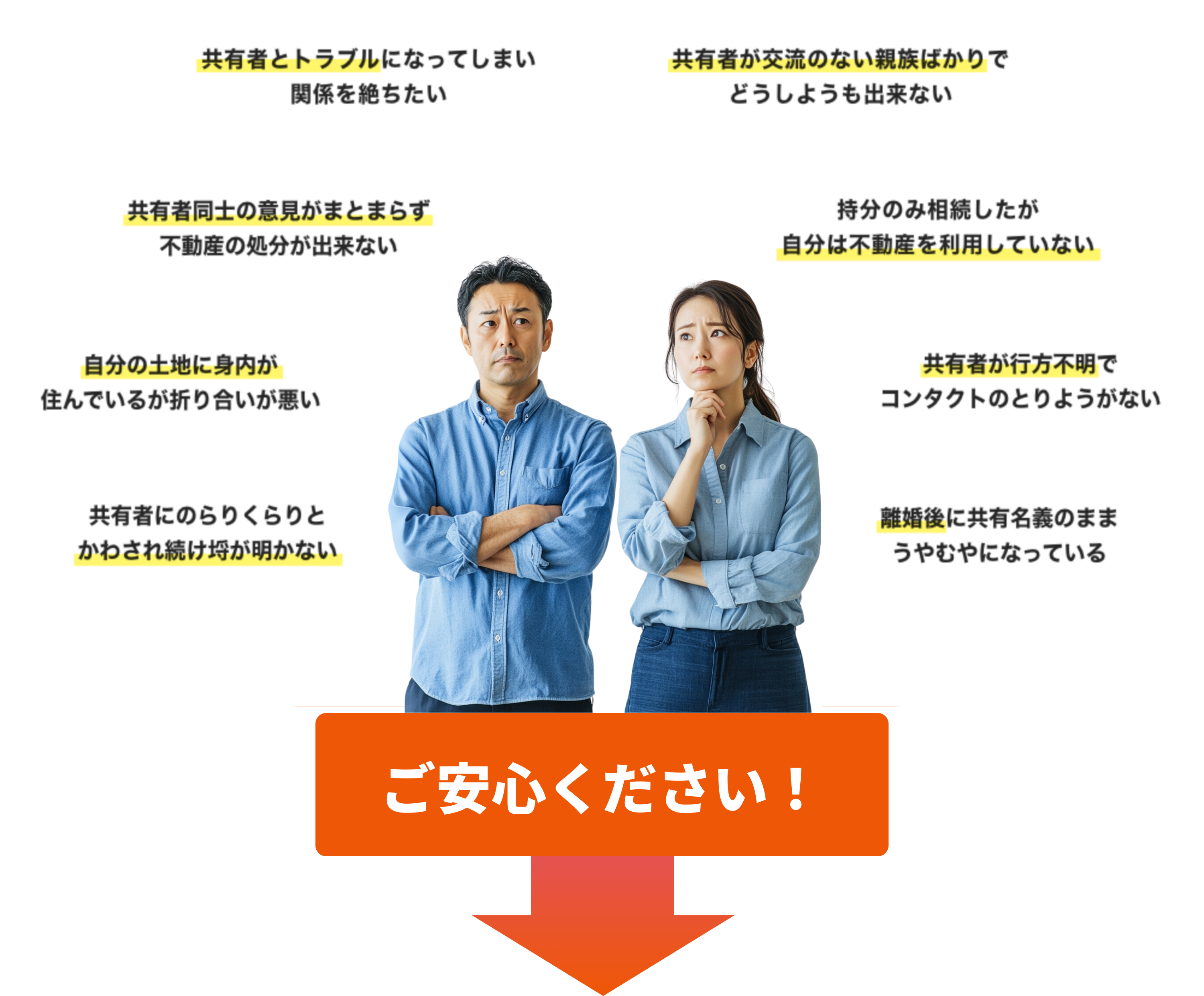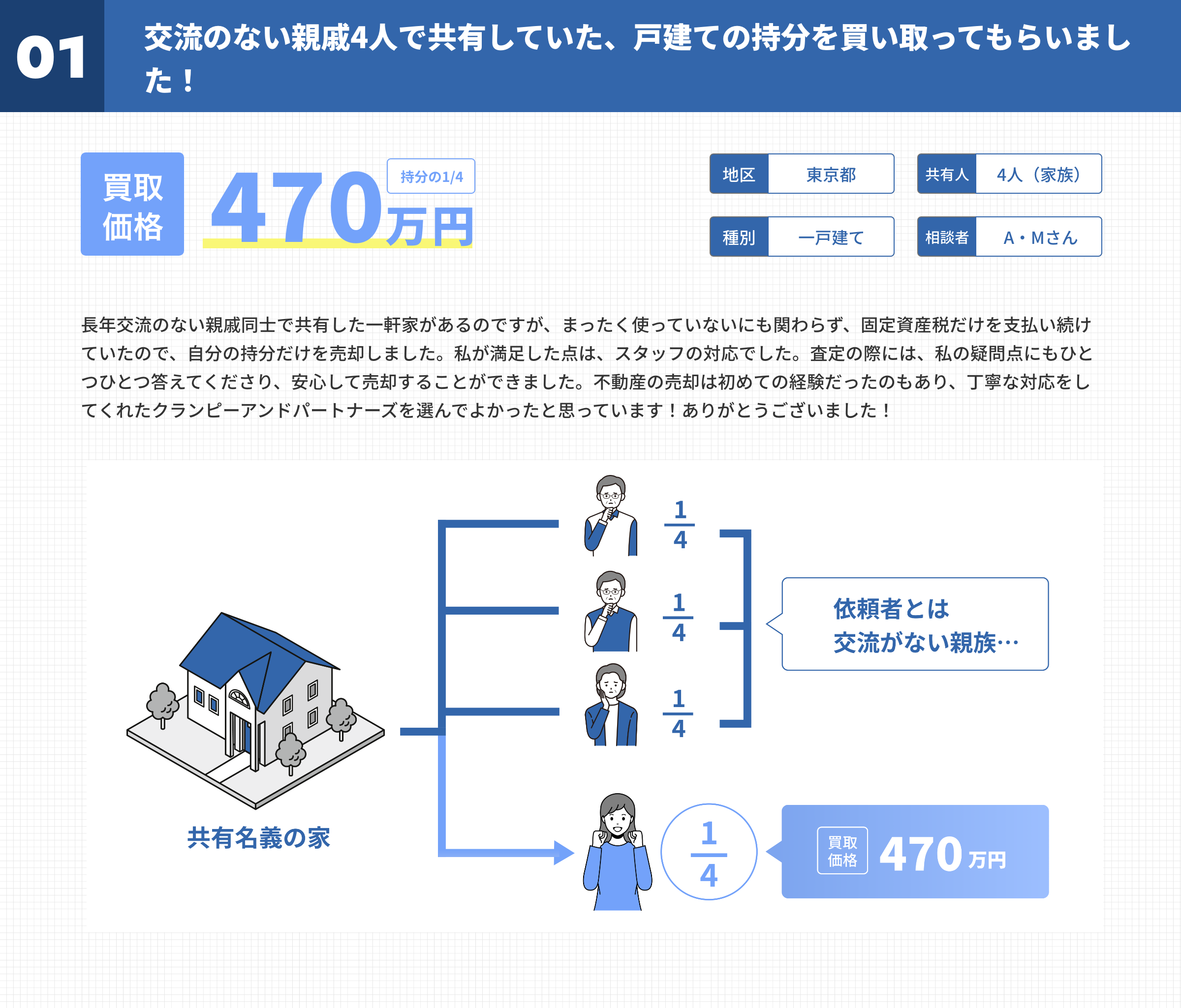 当社としては、取引によって売り主様に経済的メリットを得ていただくことはもちろん、今まで抱えていた「長年の悩みの解消」でも役立ちたいと思っています。親族間のトラブルや不当な扱い、経済的な損失などなど、、、共有名義不動産に絡む悩みは本当に様々ですが、関係を清算することで、売り主様の今後の生活がより豊かになるようなお手伝いができれば幸いです。