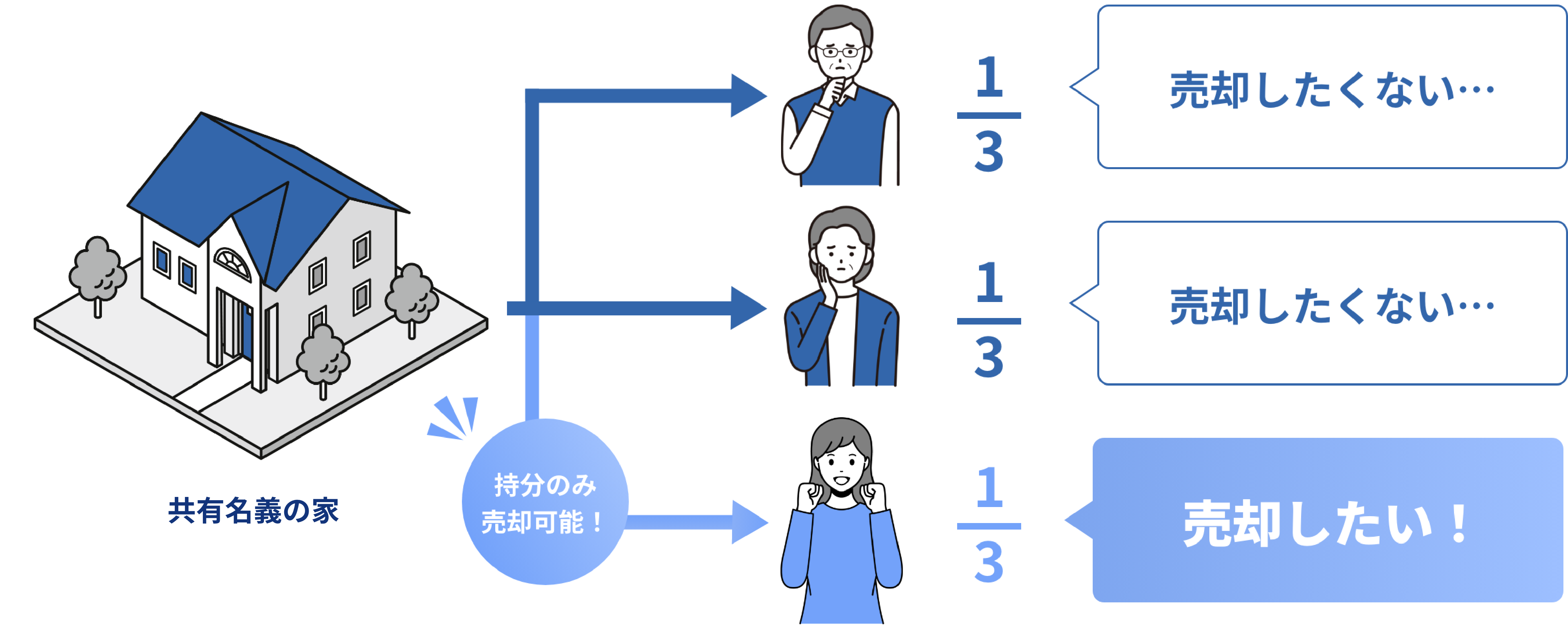 実は、共有持分、つまり自分の名義部分だけであれば、他の共有人の同意がなくても自由に売却することができます。つまり自分の名義部分だけであれば、他の共有人の同意がなくても自由に売却することができます。