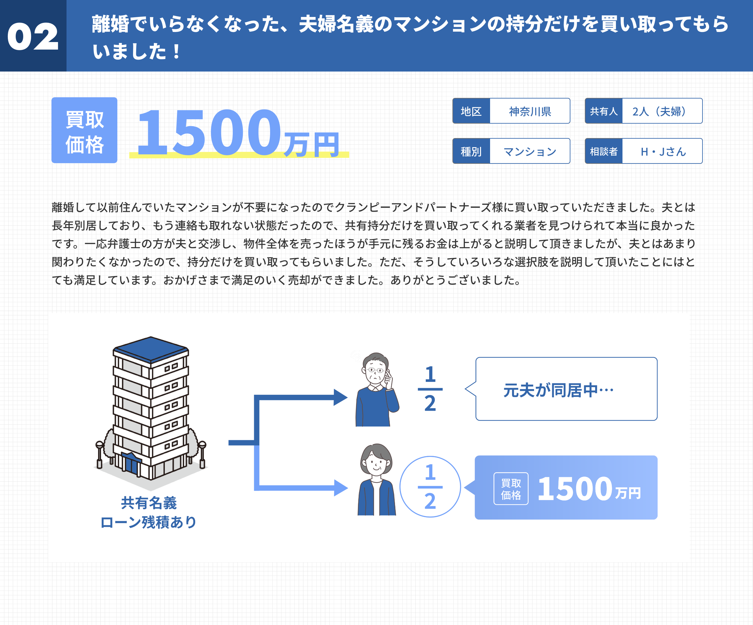 クランピーアンドパートナーズは、直接売り主様とやり取りをしきちんと査定をさせて頂いているので高値での買取ができます。共有名義不動産の売買は、離婚や相続などの背景もあり複雑な状況であることがほとんどです。